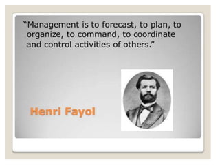 3. Various management theories are outlined including administrative management, bureaucracy, behavioral management, management science, and organization-environment theories. Principles of management by Henry Fayol are defined.