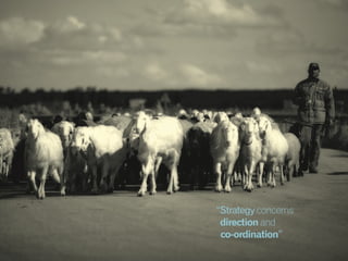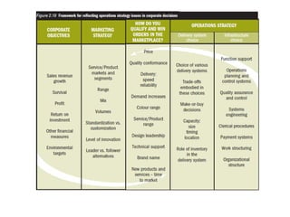 This document discusses levels of strategy within businesses and how to develop an operations strategy. It covers key points such as the different levels of strategy from corporate to business unit to functional, understanding customer requirements through order-winners and qualifiers, and different approaches to developing strategy such as top-down vs bottom-up and market-driven vs market-driving. The document uses examples like a pit stop, factory, and restaurant to illustrate operations processes and strategic objectives.