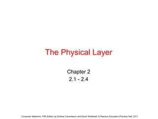 The document discusses various methods for transmitting data through communication networks, including guided transmission media like twisted pair cables, coaxial cables, fiber optics, and wireless transmission via radio waves, microwaves, infrared, light, or communication satellites. It covers theoretical concepts like Fourier analysis, bandwidth-limited signals, and Shannon's formula for channel capacity. Different transmission media are compared in terms of their bandwidth, attenuation characteristics, and use cases for data transmission.