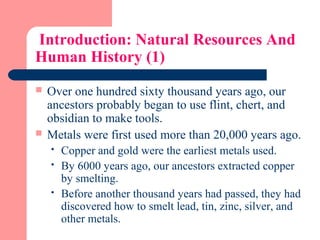This document discusses mineral and energy resources. It begins by describing how early humans began using minerals like flint and metals over 20,000 years ago. It then covers the formation of different types of mineral deposits including hydrothermal deposits formed from hot aqueous solutions, magmatic deposits within igneous rocks, and sedimentary deposits from precipitation or weathering. Specific examples of important mineral deposits are provided for different minerals. The document concludes by discussing classifications of useful mineral substances and various energy resources.