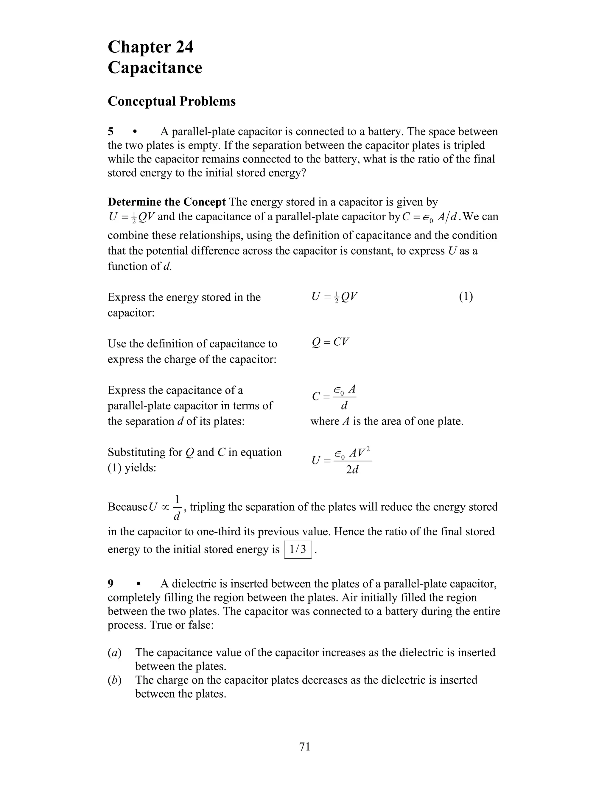 (1) The document discusses capacitance concepts including the capacitance of parallel plate, cylindrical, and spherical capacitors. (2) It provides equations to calculate the capacitance, electric field, and energy stored in capacitors. (3) Key equations include expressions for capacitance as a function of plate area and separation, and energy stored as proportional to capacitance times the square of the potential difference.