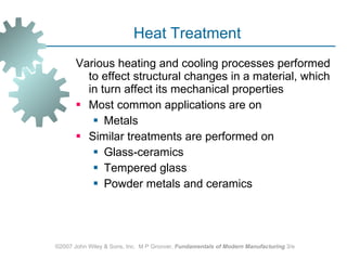 The document discusses various heat treatment methods used in manufacturing to alter the mechanical properties of metals. It describes common heat treatments like annealing, hardening, and surface hardening. Annealing is used to soften metals by heating and slow cooling. Hardening involves rapidly cooling from high temperatures to form hard martensite. Surface hardening methods like carburizing add carbon to the surface. Heat treatments require specialized furnaces, and some methods selectively heat only surface areas.