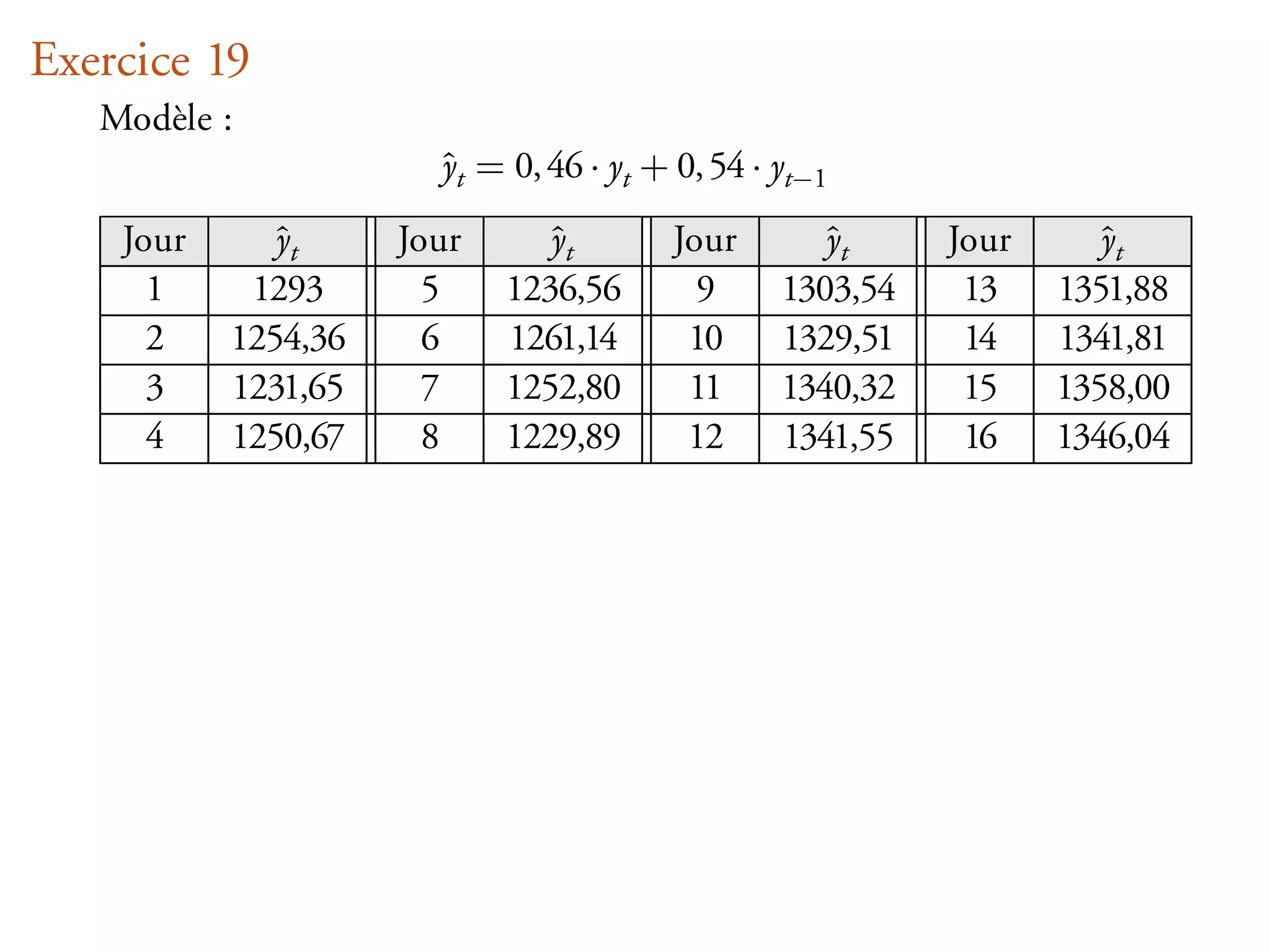Modèle : ˆt = 0, 46 · yt + 0, 54 · yt−1 y Jour ˆt y Jour ˆt y Jour ˆt y Jour ˆt y 1 1293 5 1236,56 9 1303,54 13 1351,88 2 1254,36 6 1261,14 10 1329,51 14 1341,81 3 1231,65 7 1252,80 11 1340,32 15 1358,00 4 1250,67 8 1229,89 12 1341,55 16 1346,04