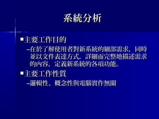 本章主要介绍系统分析工具,重点在于理解用户对新系统的需求,建立系统的数据流程图及数据字典,以促进项目组成员与用户之间的沟通。数据流程图用于表达系统中的数据流动,包括转化处理、数据存储和外部环境的交互。绘制数据流程图时需遵循逻辑性、可分解性及层次性的原则,以确保信息的准确传递和系统的清晰理解。