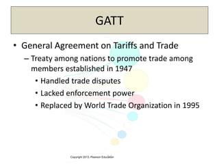 The document discusses the evolution of international trade agreements from GATT to the modern World Trade Organization (WTO). It then describes different types of preferential trade agreements (PTAs) that exist, ranging from free trade areas with no common external tariffs (like NAFTA) to full economic unions with a single currency and coordinated policies (like the European Union). Several existing regional trade blocs are also outlined, such as ASEAN, MERCOSUR, and the Gulf Cooperation Council.