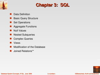 This chapter discusses SQL (Structured Query Language), the most popular language for interacting with relational database management systems. The chapter covers SQL's data definition language for defining schemas, domains, and integrity constraints. It also covers the basic SELECT statement structure for queries with FROM, WHERE, and JOIN clauses. Additional topics include views, data modification, and aggregation functions.
