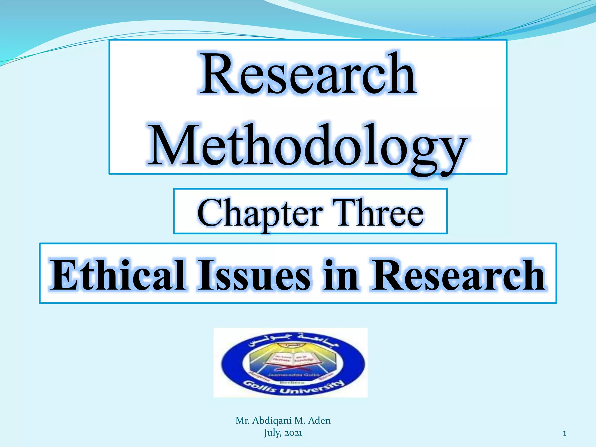 This document discusses ethical issues in research. It begins by outlining the chapter objectives, which are to explain ethics in research, identify common ethical issues, and discuss other issues. The main section defines research ethics and explores the four key ethical issues: informed consent, privacy and confidentiality, anonymity, and the researcher's responsibilities. It also notes other issues like behavior modification, deception, concealment, and plagiarism. Throughout, it emphasizes respecting participants' dignity, obtaining their full consent, protecting their privacy and anonymity, and researchers' integrity and accountability.