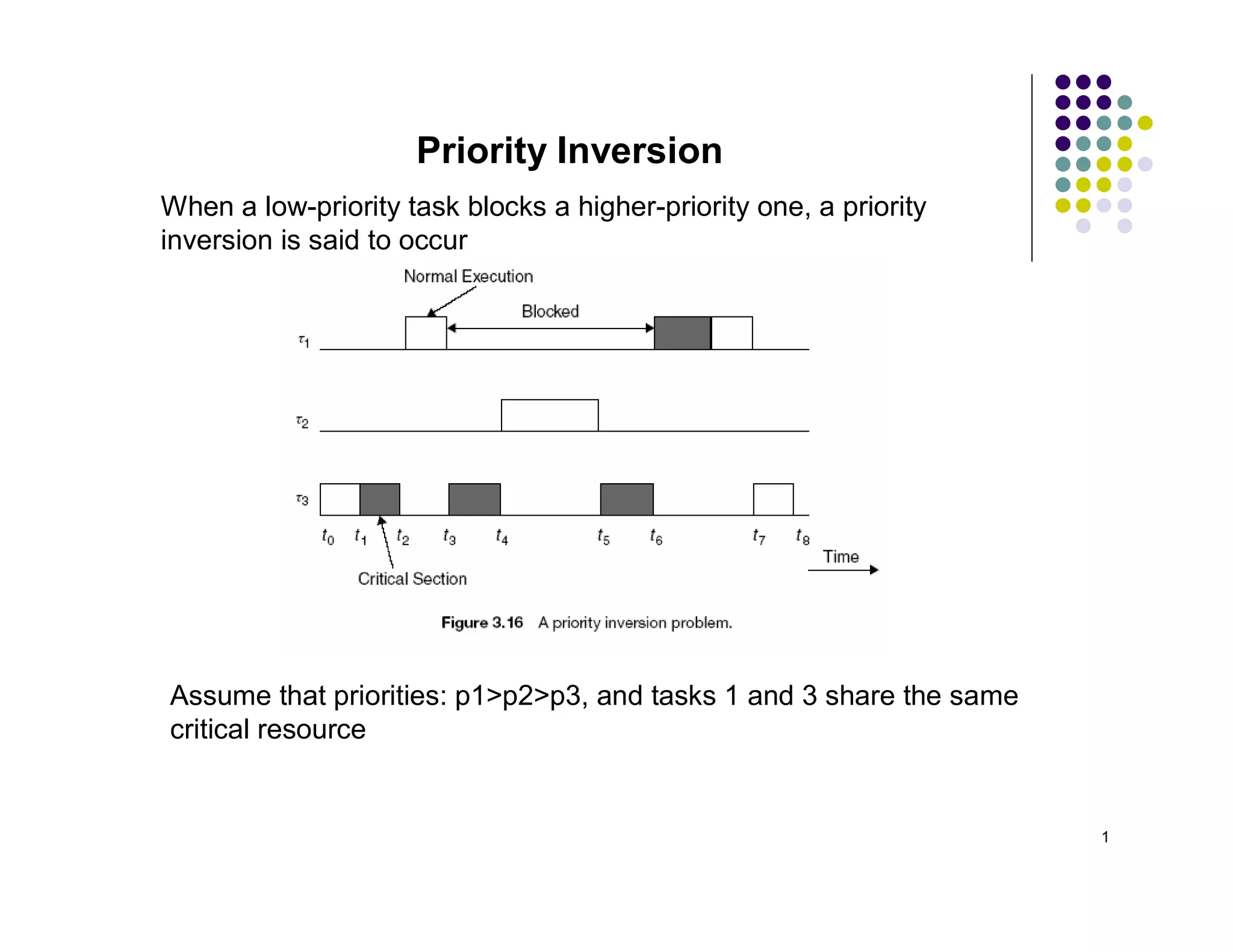 1) The Priority Inheritance Protocol dynamically changes the priority of any task in a critical section to the priority of the highest task pending on the same critical resource.