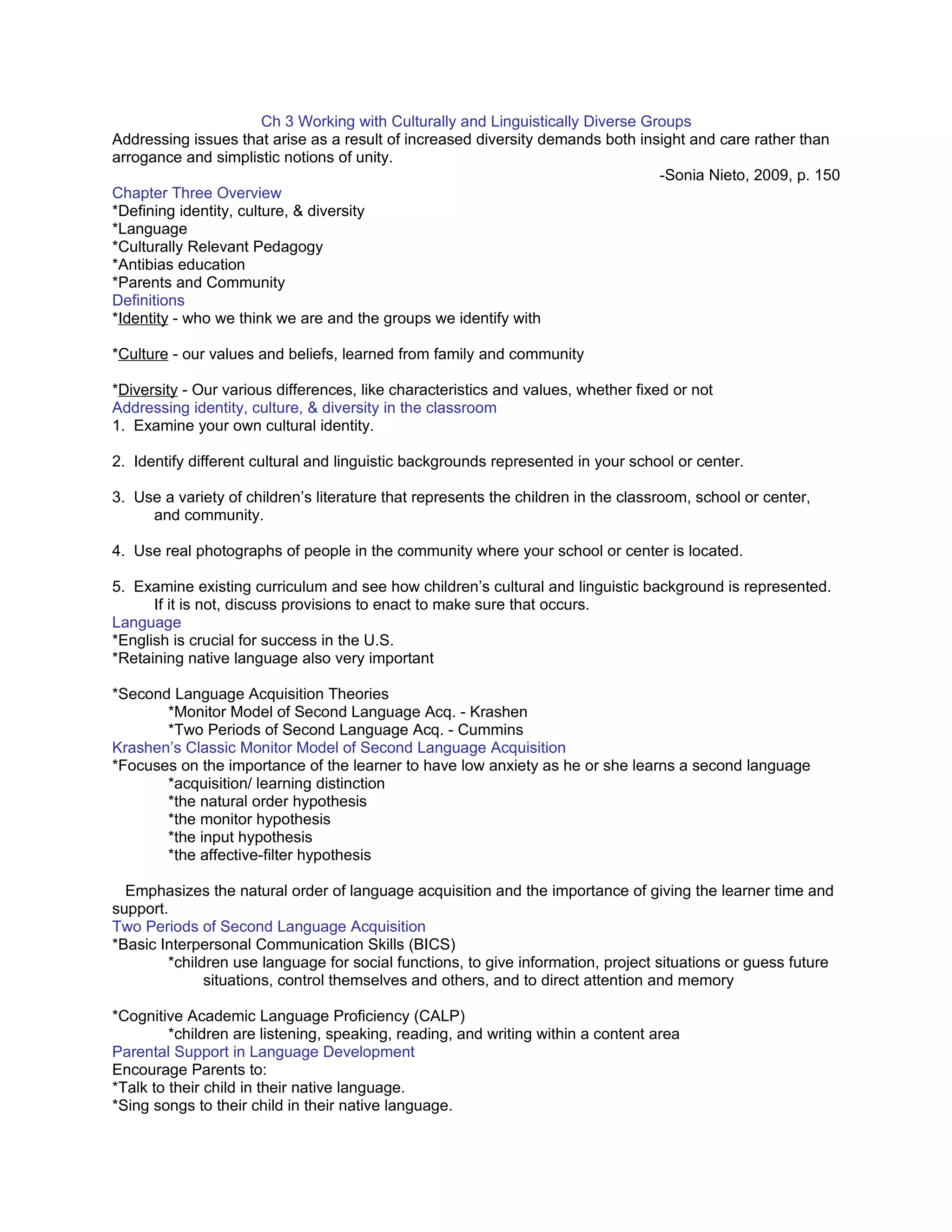 This document summarizes key concepts from Chapter 3 on working with culturally and linguistically diverse groups. It defines important terms like identity, culture, and diversity. It discusses the importance of examining one's own cultural identity and representing all cultures in the classroom. Theories on second language acquisition, like Krashen's Monitor Model, are outlined. The document also discusses culturally relevant pedagogy, antibias education, and best practices for communicating with diverse families and communities.