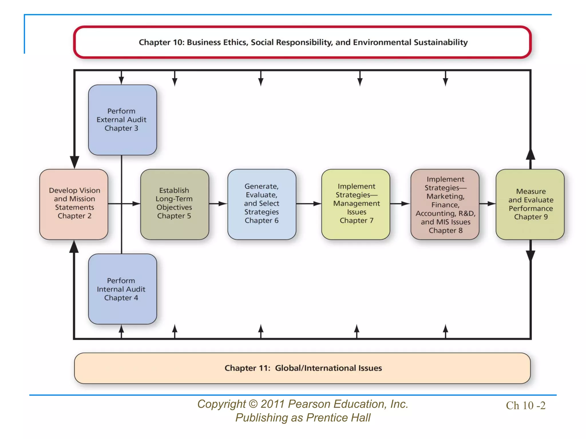 This document is from a chapter on business ethics, social responsibility, and environmental sustainability. It discusses key topics related to establishing principles of ethical conduct in organizations, developing codes of business ethics, and training employees on ethics. It also addresses the importance of social responsibility and protecting the environment, including strategies for firms to become more sustainable and issues like global warming. The chapter presents ideas for integrating ethics and social considerations into strategic planning and decision making.