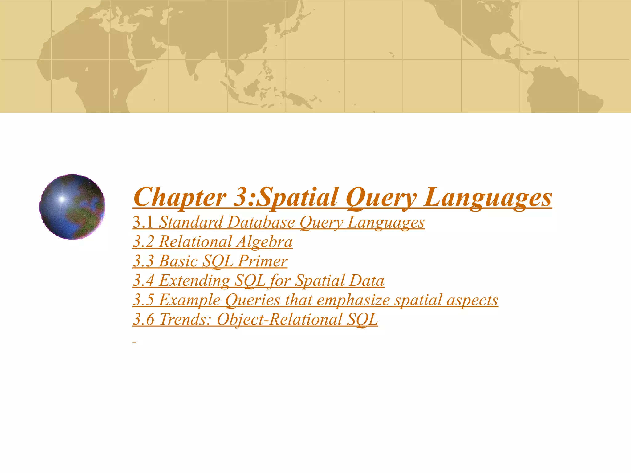 The document discusses spatial query languages and SQL. It begins by introducing learning objectives about understanding query languages, using SQL, extending SQL for spatial data, and trends in query languages. It then provides examples of using SQL to query spatial data by making use of the Open Geodata Interchange Standard (OGIS) spatial data types and operations within SQL queries.