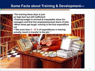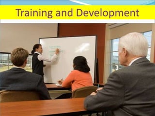 The document discusses the significance of training and development, highlighting that training is often underfunded and cut during tough times despite its importance for improving employee performance and job-specific skills. It differentiates between training, which focuses on immediate job-related skills, and development, which enhances broader capabilities for future roles. Additionally, it outlines key phases in the training process, emphasizes the importance of needs assessment, training objectives, selection of methods, and evaluation of effectiveness in ensuring that training meets its goals.