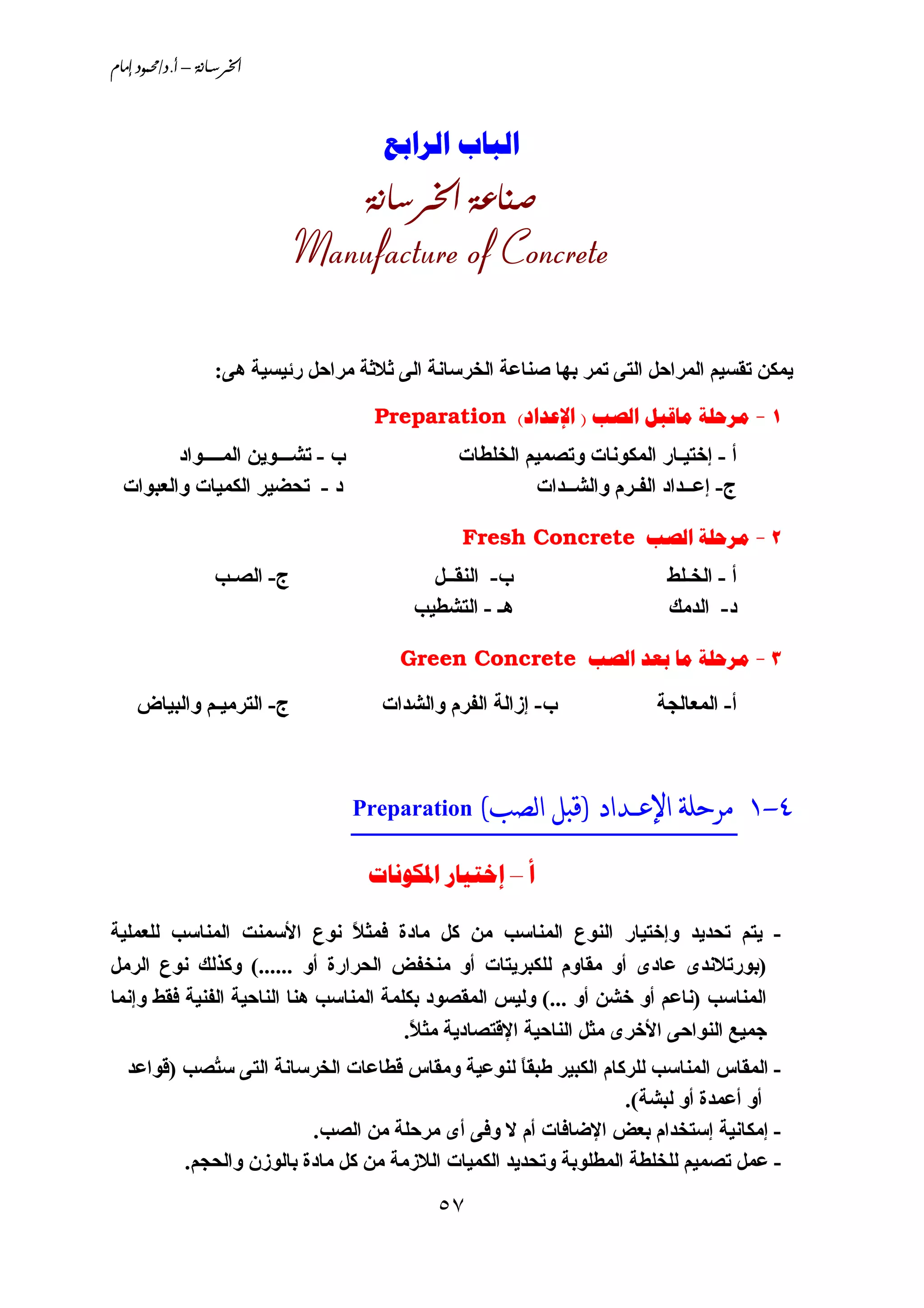 تستعرض الوثيقة مراحل صناعة الخرسانة التي تتضمن التحضير، الصب، والمعالجة، مشيرة إلى أهمية اختيار المواد المناسبة وطرق الخلط والنقل. تُفصّل الوثيقة أساليب التخزين والتعامل مع الخامات لضمان الجودة، بالإضافة إلى احتياطات السلامة أثناء عمليات الصب. كما تركز على توفير الظروف المثلى للخلطة، مثل الدقة في الأوزان والقياسات وتجنب درجات الحرارة العالية.