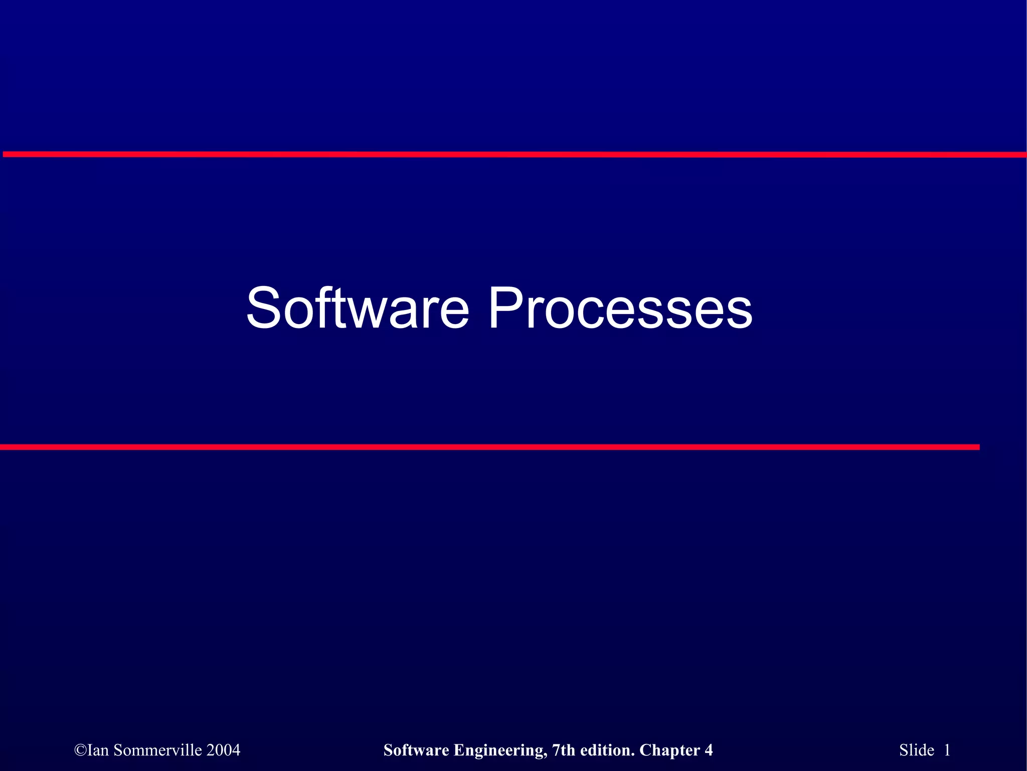 The document introduces software process models and describes three generic models: waterfall, evolutionary development, and component-based development. It also covers the Rational Unified Process model and discusses how computer-aided software engineering (CASE) tools can support software processes. Key activities like requirements, design, implementation, testing, and evolution are defined.