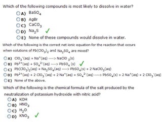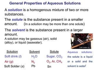 This document discusses various topics related to aqueous solutions and reactions. It begins by defining key terms like solute, solvent, electrolyte and providing examples. It then covers properties of aqueous solutions such as conductivity. Various acid-base reactions and concepts are explained like Brønsted-Lowry acids and bases, neutralization reactions. Oxidation-reduction reactions and oxidation numbers are also discussed. Finally, the document covers concentration of solutions and calculations involving molarity, dilution and preparation of solutions.