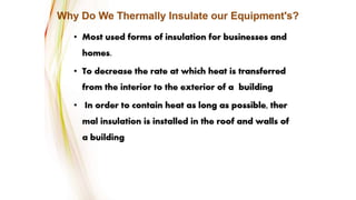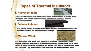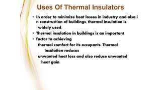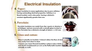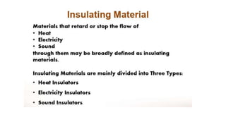 The document discusses the properties and characteristics of good insulating materials. It outlines 16 characteristics a good insulating material should possess including large insulating resistance, high dielectric strength, and resistance to deterioration from chemicals, heat, and moisture. It then covers the key properties of insulating materials, specifically their electrical, thermal, chemical, and mechanical properties. Some important electrical properties discussed are resistivity, dielectric strength, power factor, and dielectric constant. Thermal properties covered include specific heat, thermal conductivity, and resistance to heat aging. The document provides details on each of these properties and their significance for insulating materials.