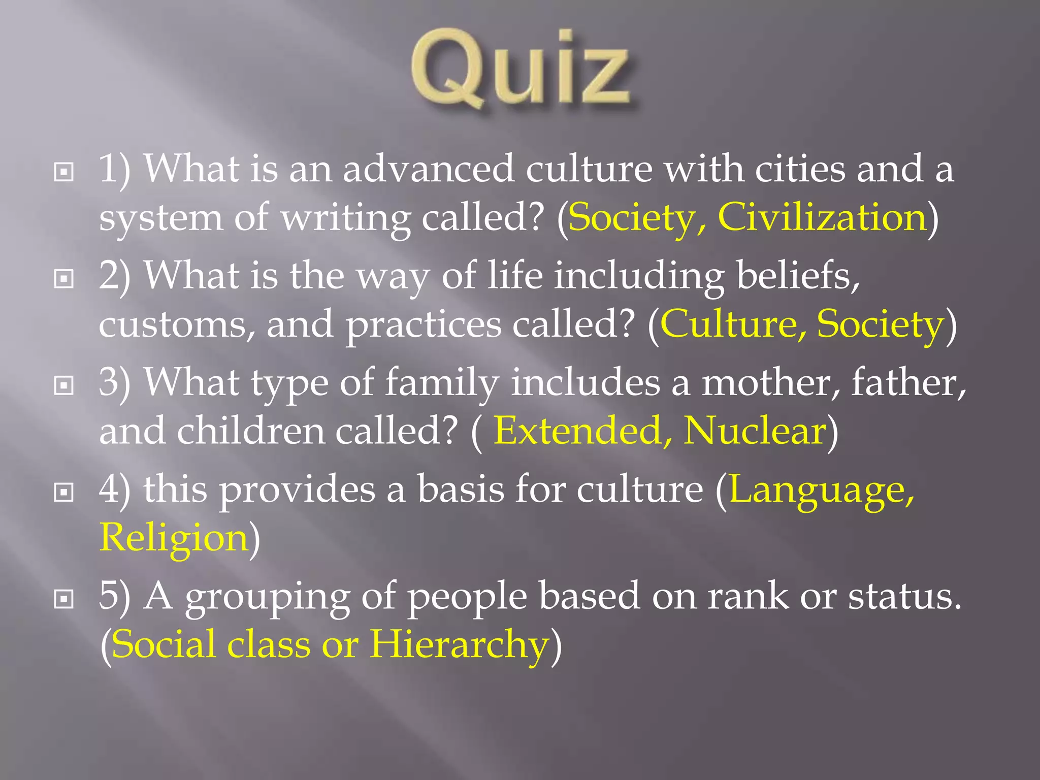 This document discusses key aspects of culture, including that culture is a people's way of life comprising beliefs, customs, and practices. It notes that cultural traits can change over time and include elements like language, spiritual beliefs, material goods, and systems of law and government. The document also examines how culture and society are organized, including through social classes based on factors like wealth, land ownership, education, and ancestry. It provides examples of nuclear and extended family structures.