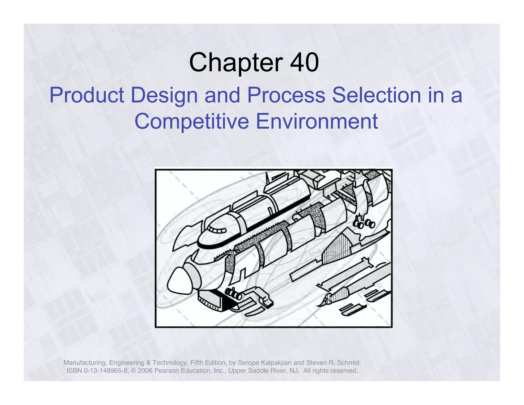 The document contains summaries and figures from the textbook "Manufacturing, Engineering & Technology, Fifth Edition" relating to product design and process selection. It includes information on the relative costs of repair at different product stages, average product lifespans, commercially available material shapes, manufacturing capabilities, tolerances, surface finishes, production times, and costs for different manufacturing processes and machinery.
