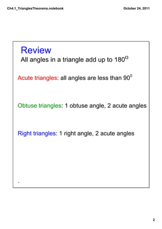This document discusses triangles and triangle theorems. It reviews the different types of triangles such as acute, obtuse, right, equilateral, isosceles, and scalene triangles. It also covers the exterior angle theorem, which states that an exterior angle of a triangle is equal to the sum of the two non-adjacent interior angles. The theorem is then proven using properties of supplementary angles and the triangle sum theorem.