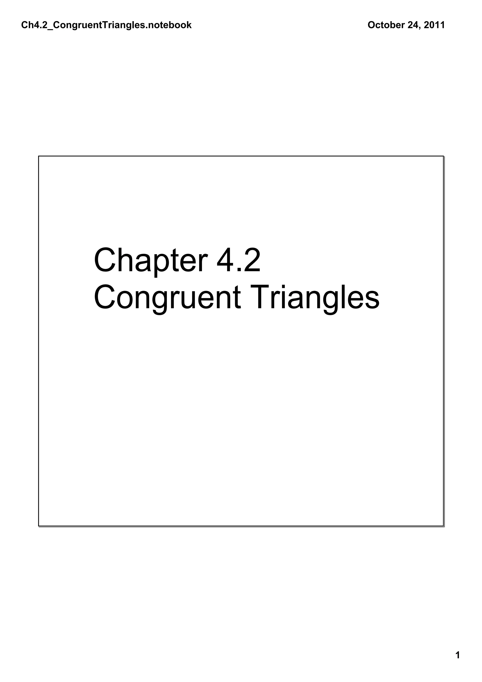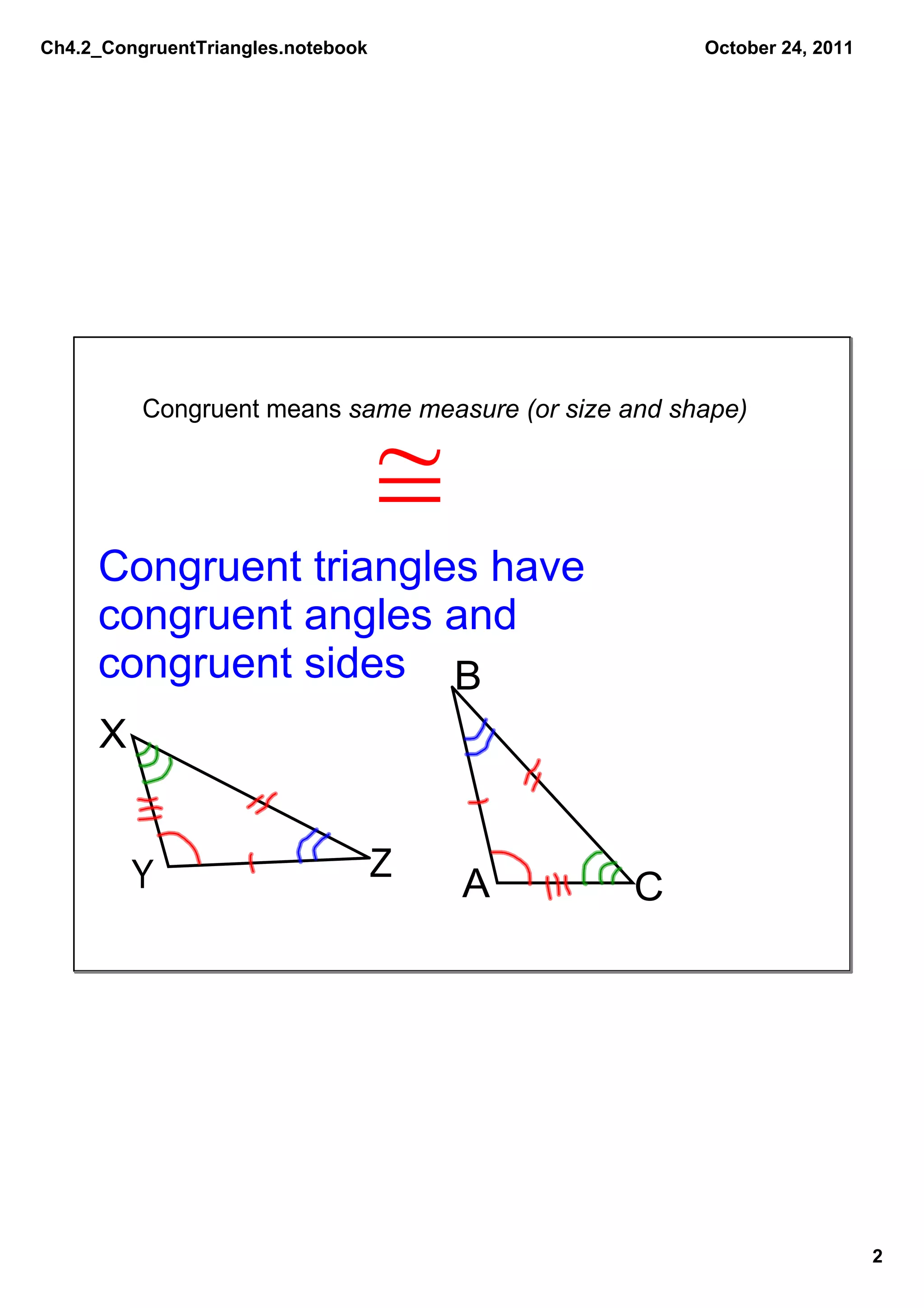 This document discusses congruent triangles. It defines congruent as having the same measure or size and shape. There are three congruence postulates discussed: SSS, SAS, and ASA. SSS states that two triangles are congruent if all three sides of one triangle are equal to all three sides of the other triangle. SAS states that two triangles are congruent if two sides and the included angle of one triangle are equal to those of the other triangle. ASA states that two triangles are congruent if two angles and the included side of one triangle are equal to those of the other triangle. Examples are provided to demonstrate applying the postulates.