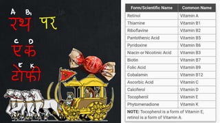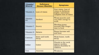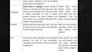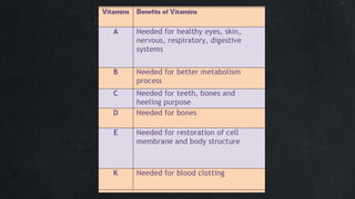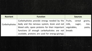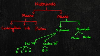 2. It describes macronutrients and micronutrients, noting that macronutrients like carbs, proteins, and fats are needed in larger amounts, while micronutrients like vitamins and minerals are needed in smaller amounts.