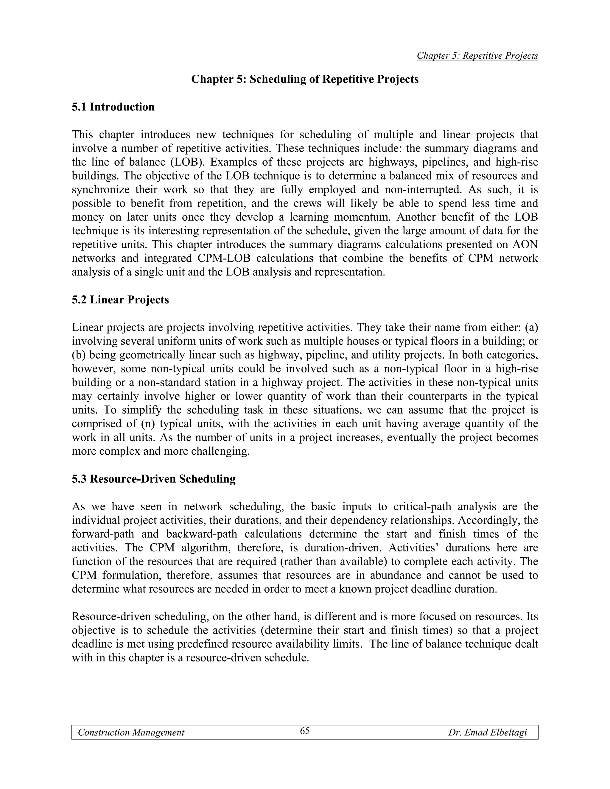 This chapter discusses techniques for scheduling repetitive projects, including summary diagrams and the line of balance (LOB) method. The LOB technique aims to balance resources and synchronize work across repetitive units so that crews are fully employed without interruption. It provides a useful visual representation of the schedule for large repetitive projects like highways, pipelines, and high-rise buildings. The chapter will cover LOB network representations, integrating CPM and LOB analyses, and using LOB to determine resource needs to meet a project deadline.