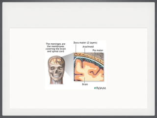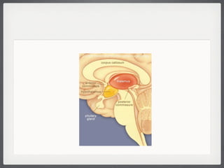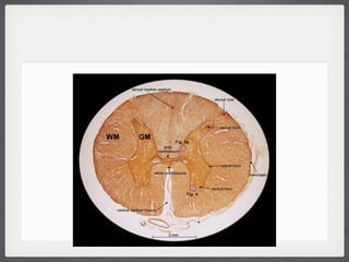 The nervous system is composed of neurons that transmit signals throughout the body via electrical and chemical signals. The central nervous system includes the brain and spinal cord, while the peripheral nervous system includes all other neurons. Sensory neurons collect information and transmit it to the central nervous system, while motor neurons transmit signals from the central nervous system to tissues. The brain controls homeostasis and interprets sensory information. It is composed of regions like the cerebrum, brainstem, and cerebellum. The peripheral nervous system includes sensory receptors, motor neurons, and the autonomic nervous system. Neurons transmit signals via action potentials generated by ion flow across membranes. Neurotransmitters transmit signals between neurons. Sensory systems allow the detection of stimuli