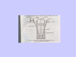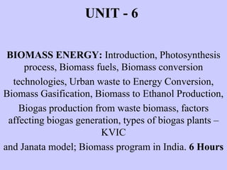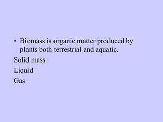 This document discusses biomass energy and biogas production. It describes photosynthesis, biomass fuels, and factors that affect biogas generation such as pH, temperature, loading rate, and retention time. It also discusses types of biogas plants and the advantages of anaerobic digestion which include producing a stable sludge and reducing pathogens. Biogas can be used to reduce coal consumption and air pollution. The document classifies biogas plants as either continuous or batch systems and describes common dome and drum reactor designs.