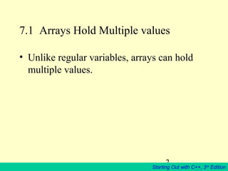 This document discusses arrays in C++. It begins by explaining that arrays can hold multiple values of the same type, unlike regular variables. Different examples of array declarations and initialization are provided. The document also discusses accessing individual array elements using subscripts, and that C++ does not perform bounds checking on arrays. Processing the contents of arrays is described as being similar to regular variables. Finally, the use of parallel arrays to relate data is covered through an example of storing employee hours and pay rates in separate but corresponding arrays.