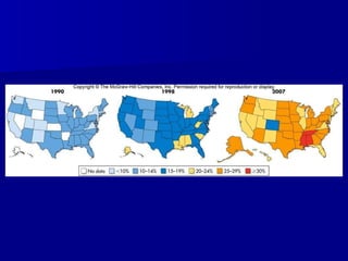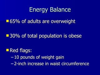 This document provides an overview of energy balance and weight control. It discusses factors that influence basal metabolism and physical activity, and how they impact energy needs and expenditure. The document estimates calorie needs and defines healthy versus unhealthy body weights using BMI. It also examines causes of obesity and strategies for successful weight loss and maintenance through calorie control, physical activity, and behavior modification.
