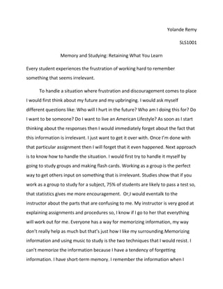This document discusses strategies for overcoming frustration when studying irrelevant material. It suggests focusing on your future goals and upbringing to stay motivated. Working in study groups can help, as studies show 75% of students are likely to pass if they work as a group. The author also recommends talking to instructors for clarification or tutoring to understand the importance of unfamiliar topics. While memorization and music don't work well for the author, the example of Norton studying in groups influences them to consider collaborating over working alone.