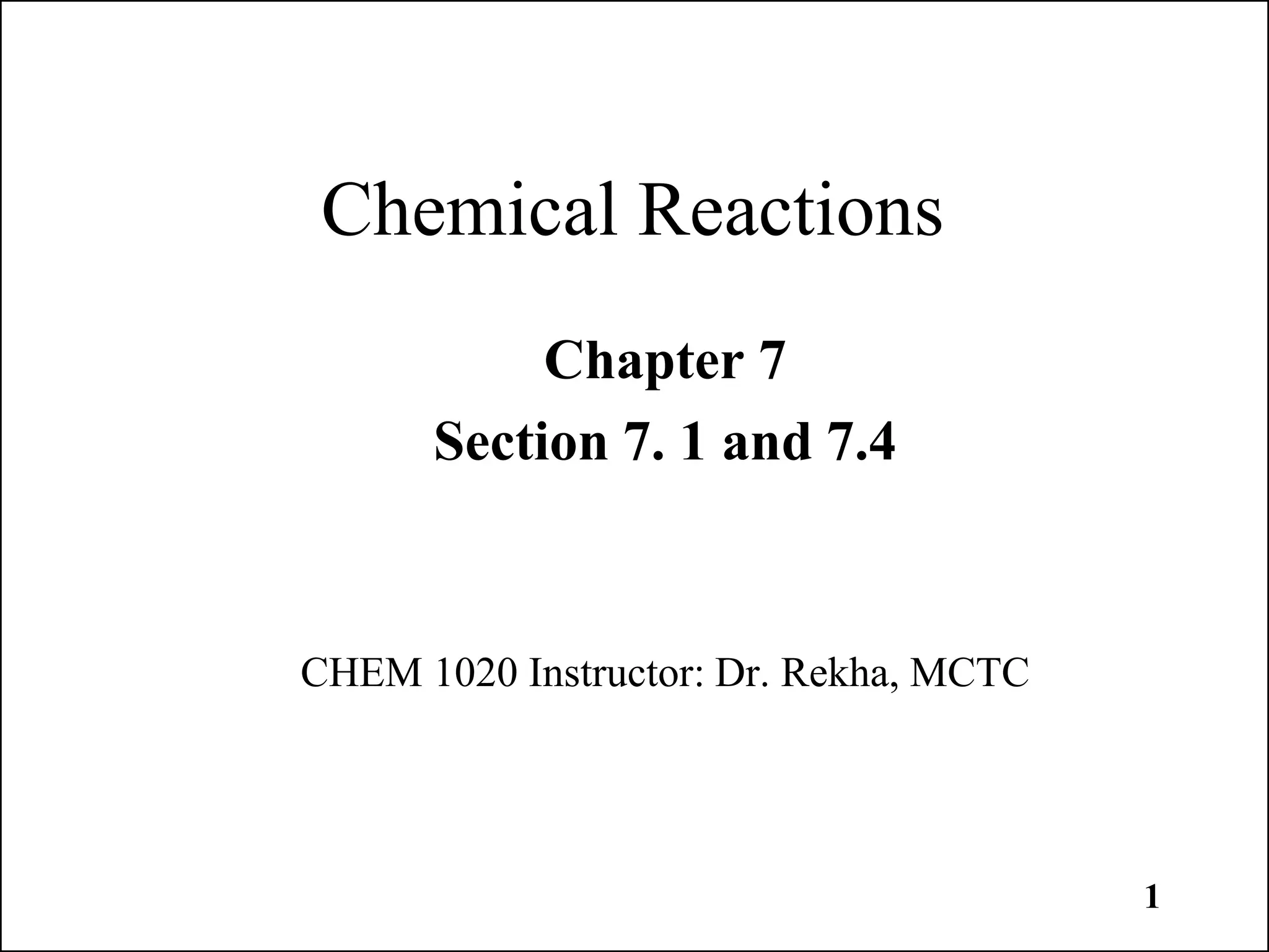 This document discusses chemical reactions and how to write and balance chemical equations. It defines chemical reactions as when new substances are formed with new properties, whereas physical changes only alter physical properties. To identify if a reaction occurred, one looks for evidence like new colors, gas formation, or heat/light production. Chemical equations represent reactions, with reactants on the left and products on the right. Formulas replace word names and physical states are indicated. Equations are balanced by adding coefficients to ensure equal numbers of each type of atom/ion on both sides of the equation. Several examples demonstrate how to write word equations, convert to formulas, and balance chemical equations.