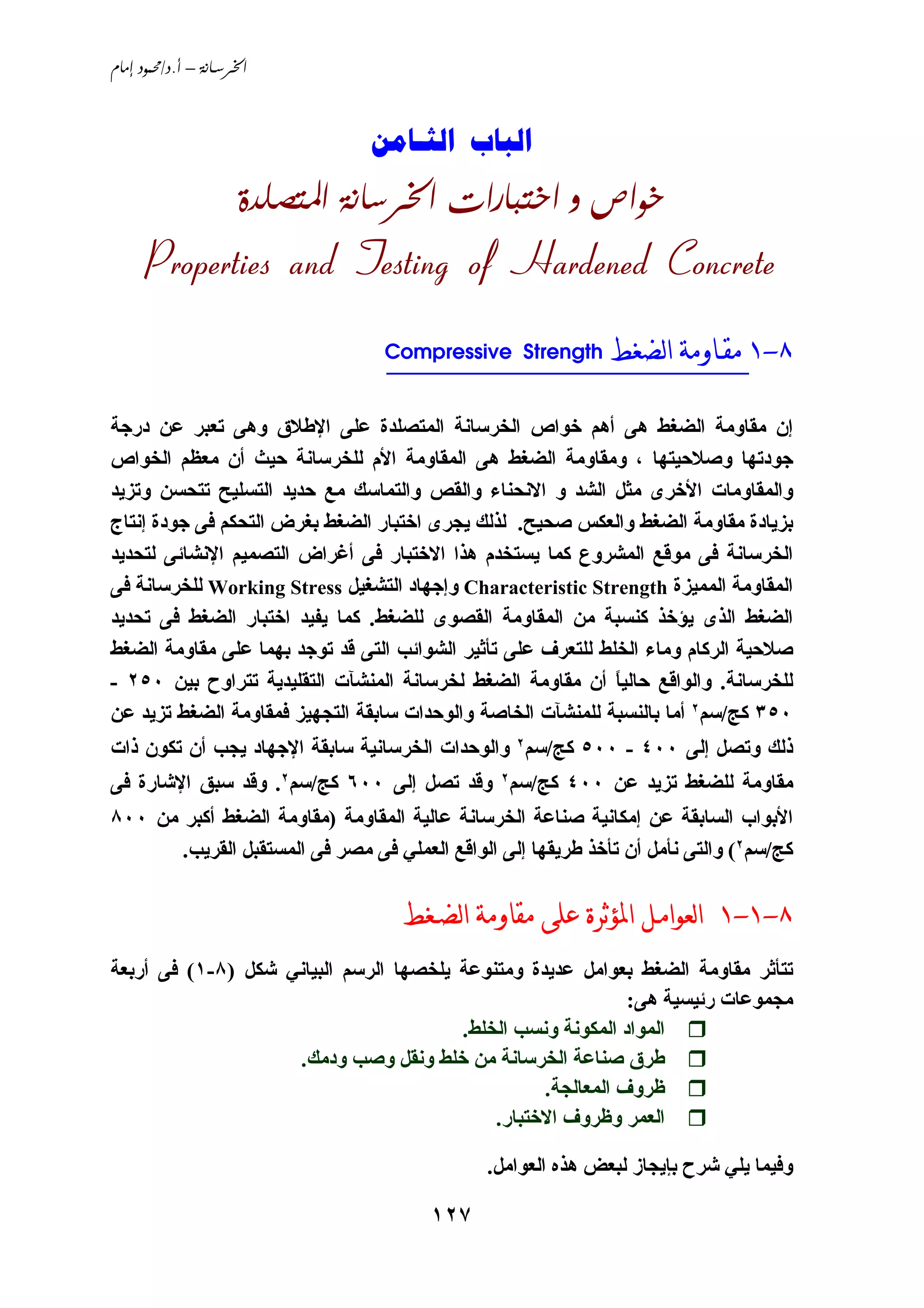 تتناول الوثيقة مقاومة الضغط للخرسانة المتصلدة، حيث تعد هذه المقاومة هي الأهم وتعبر عن جودة الخرسانة. تؤثر عدة عوامل على مقاومة الضغط، مثل المواد المستخدمة ونسب الخلط وظروف المعالجة ومدة الاختبار. كما تشير الوثيقة إلى أهمية الأسمنت ونوع الركام ونسبة الماء إلى الأسمنت في تحسين تلك المقاومة.
