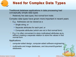Object-oriented databases were developed to better support complex data types and object-oriented programming. The key aspects of the object-oriented data model include: