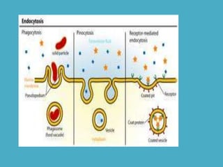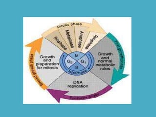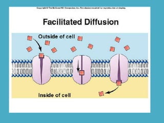 Three key factors - concentration, temperature, and pressure - affect the rate of diffusion, which is the movement of particles from an area of higher concentration to lower concentration. Osmosis is the diffusion of water across a selectively permeable membrane, and regulates water flow to maintain homeostasis. Cells in hypotonic solutions swell as water enters, hypertonic solutions cause water to leave and cells to shrink. Passive transport uses channel or carrier proteins and requires no energy, while active transport moves substances against gradients using energy. Endocytosis and exocytosis transport large particles in and out of cells. The eukaryotic cell cycle includes interphase and the phases of mitosis (prophase, metaphase, anaphase, telophase