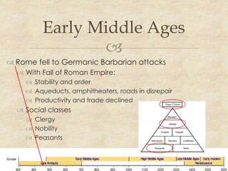 The document summarizes the political and social changes in Europe during the Early Middle Ages following the fall of the Western Roman Empire. It describes the decline of stability, infrastructure, and trade. The Catholic Church grew powerful by providing structure, education, and aid where governments could not. The papacy in Rome increased its authority based on the false "Petrine Theory" of papal supremacy. New kingdoms like the Franks emerged, and the Carolingian dynasty came to power with support from the pope.