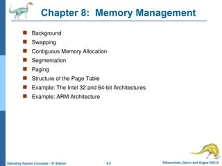 Chapter 8 of 'Operating System Concepts' covers main memory management techniques, including swapping, contiguous allocation, segmentation, and paging. It explains the differences between logical and physical address spaces, the role of the memory-management unit (MMU), and the significance of dynamic memory allocation strategies. Key issues such as fragmentation, memory protection, and the structure of page tables are also discussed to provide a comprehensive understanding of memory management in operating systems.