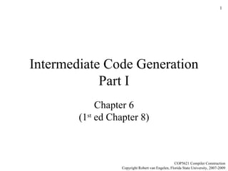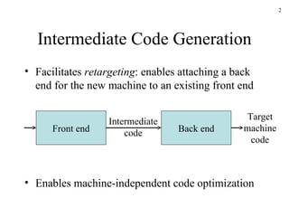 The document discusses intermediate code generation in compiler construction. It covers several intermediate representations including postfix notation, three-address code, and quadruples. It also discusses generating three-address code through syntax-directed translation and the use of symbol tables to handle name resolution and scoping.