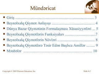 Giriş ............................................................................... ... 3 Beynəlxalq Qiymət Anlayışı ............................................. 4 Dünya Bazar Qiymətinin Formalaşması Xüsusiyyətləri ... 5 Beynəlxalq Qiymətlərin Funksiyaları ................................7 Beynəlxalq Qiymətlərin Növləri ....................................... 8 Beynəlxalq Qiymətlərə Təsir Edən Başlıca Amillər ......... 9 Mənbələr ........................................................................ 10 Mündəricat