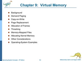 This document summarizes key concepts from Chapter 9 of the textbook "Operating System Concepts - 8th Edition" on virtual memory. It discusses demand paging, where pages are brought into memory only when needed; copy-on-write, which allows processes to initially share pages; page replacement algorithms like FIFO and LRU that select pages to swap out when new pages are needed; and the risks of thrashing when processes do not have enough allocated memory. The document provides examples and diagrams to illustrate these virtual memory techniques.