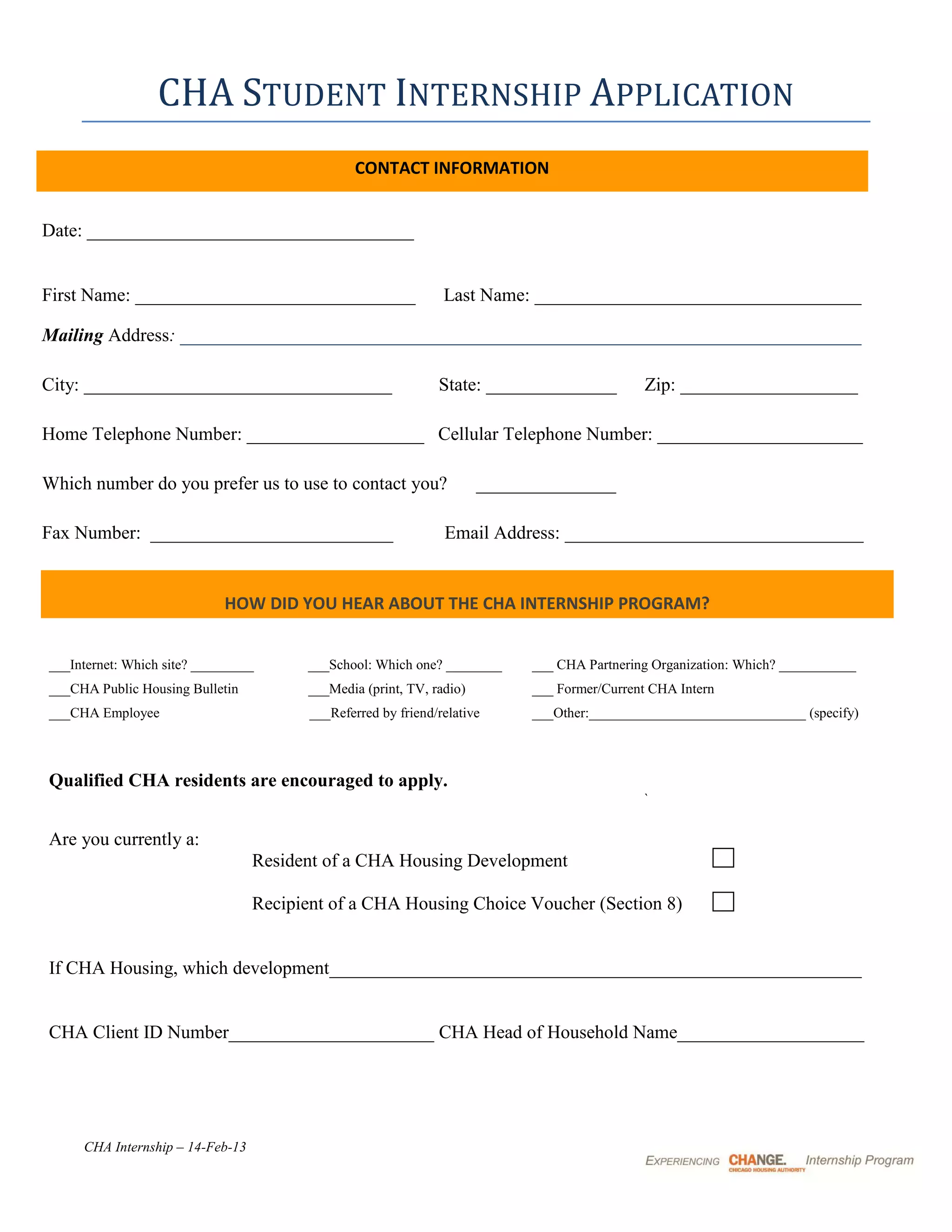 This document contains an application for an internship with the CHA (Chicago Housing Authority). It requests contact information from the applicant, how they heard about the program, their housing status with CHA if applicable, employment and education history, languages spoken, and reference contact details. Qualified CHA residents are encouraged to apply for the internship opportunity.