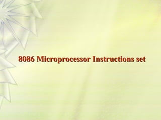The document provides a detailed overview of the instruction set for the 8086 microprocessor, including data transfer, arithmetic, logical, and control instructions. It describes various mnemonics, their meanings, the formats of these instructions, and the flags affected by their operations. Additionally, it includes examples of usage for multiplication, division, and string operations, highlighting the versatility and functionality of the instruction set.