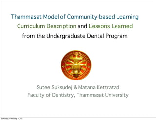 The document describes the Thammasat Model of Community-based Learning curriculum used in the undergraduate dental program at Thammasat University. It involves exposing students to diverse community-based activities in a safe environment over multiple phases. Students gain experience in areas like health promotion, epidemiology, and community dentistry through fieldwork placements. Both students and faculty provide feedback on their experiences, noting benefits like understanding oral health issues but also challenges like student fatigue, ensuring all learn minimum requirements, and applying theory to practice.
