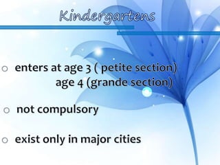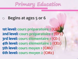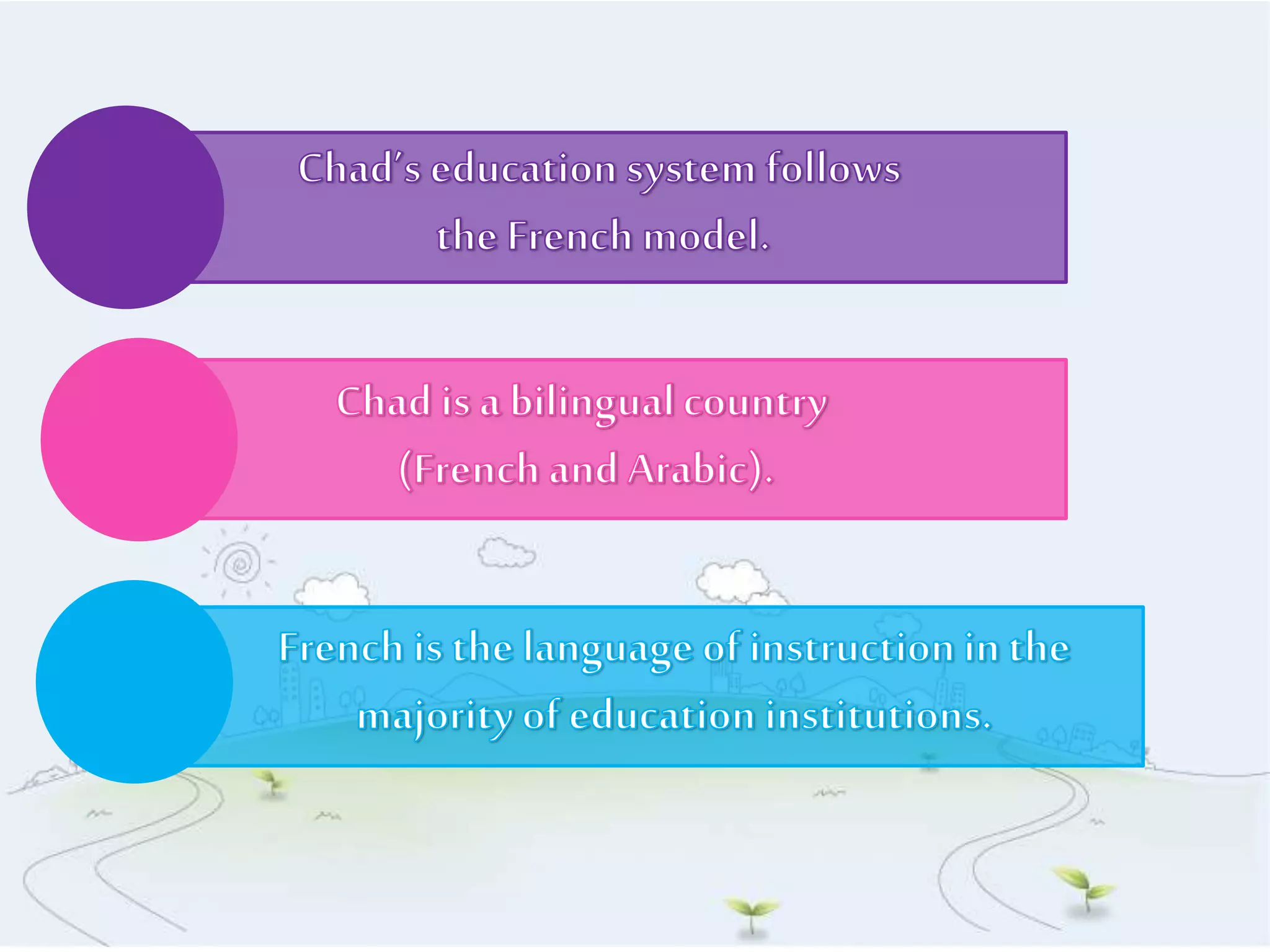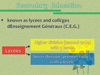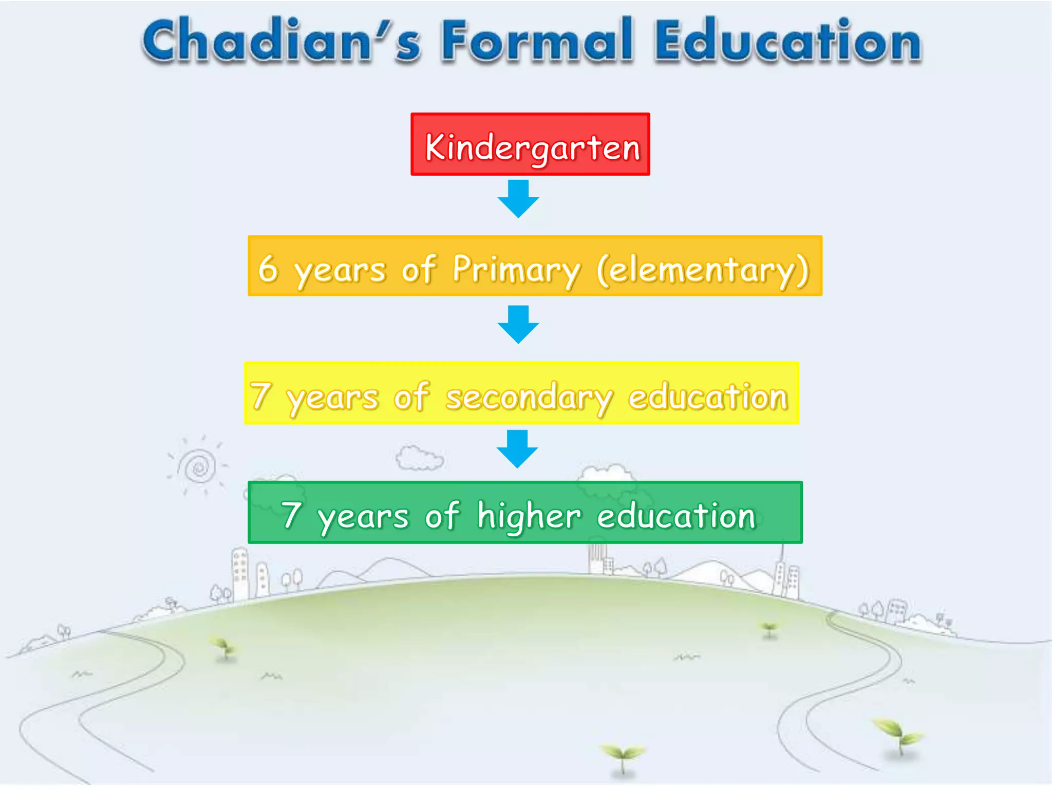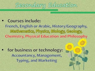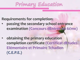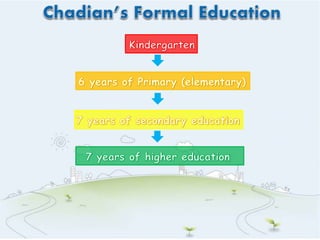 This document summarizes the higher education system in Chad. It describes the different types of high school programs that students can choose from and the Baccalaureate exam needed to graduate. It then outlines the main institution, the University of N'Djamena, which includes faculties of law/economics and arts/human sciences. The university offers degrees from the 2-year DEUG to the doctorate level. It also mentions some other vocational institutions that provide certificates and associate degrees in fields like business and technology. Finally, it briefly describes King Faisal University which focuses on Arabic language and offers degrees up to the doctorate level.