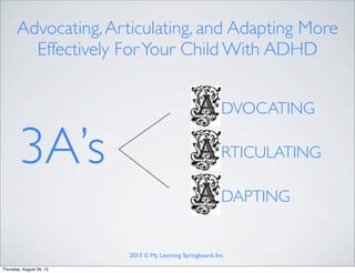 The document provides an overview of Attention-Deficit Hyperactivity Disorder (ADHD), including its symptoms, diagnostic criteria from the DSM-V, and associated comorbid conditions. It also outlines parents' rights regarding education plans (IEP vs. 504 Plan), accommodations for students with ADHD, and strategies for enhancing student-teacher relationships in the classroom. Furthermore, it presents legal frameworks and resources for parents navigating the educational needs of children with ADHD.