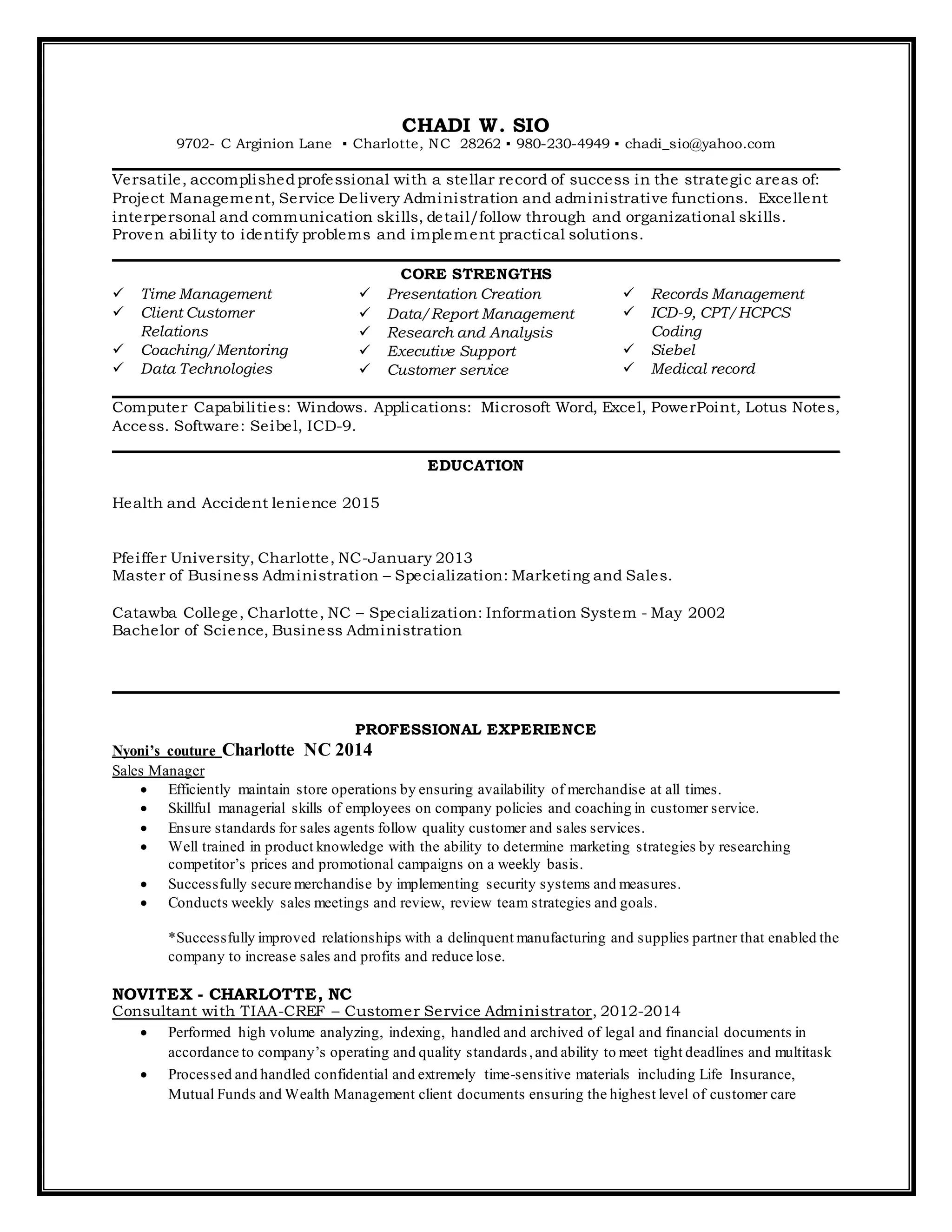 This resume is for Chadi W. Sio, who has over 15 years of experience in project management, administration, customer service, and medical coding. They have a Master's in Business Administration and Bachelor's in Information Systems. Their most recent role was as a Sales Manager for a clothing boutique where they improved relationships with suppliers and increased sales. Prior experience includes roles in customer service, administration, and medical coding at companies such as Novitex, Allstate Insurance, Wachovia Bank, and Bank of America. They also volunteered as a medical coder.