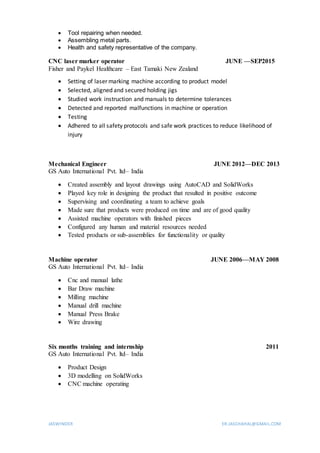 This document contains the resume of Jaswinder Singh Chahal, a mechanical engineer with over 3 years of experience in designing, manufacturing, automating and testing. He has skills in CAD, 3D modeling, drawing, instrumentation, and automation. His experience includes roles as a machinist, CNC laser operator, mechanical engineer, and machine operator. He holds a Graduate Diploma in Computer Aided Design from Christchurch Polytechnic Institute of Technology and a Bachelor of Technology in Mechanical Engineering from Punjab Technical University.