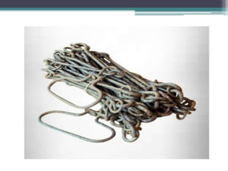 Chain surveying is a method of surveying that measures distances directly in the field without taking angular measurements, utilizing instruments like chains and tapes for various tasks such as determining area and boundaries. The document outlines the types and purposes of chains, including metric and non-metric chains, and details related surveying tools such as ranging rods, cross staffs, and plumb bobs. It emphasizes the practical applications of these tools in engineering and land measurement, showcasing the evolution and specifications of different chain types.