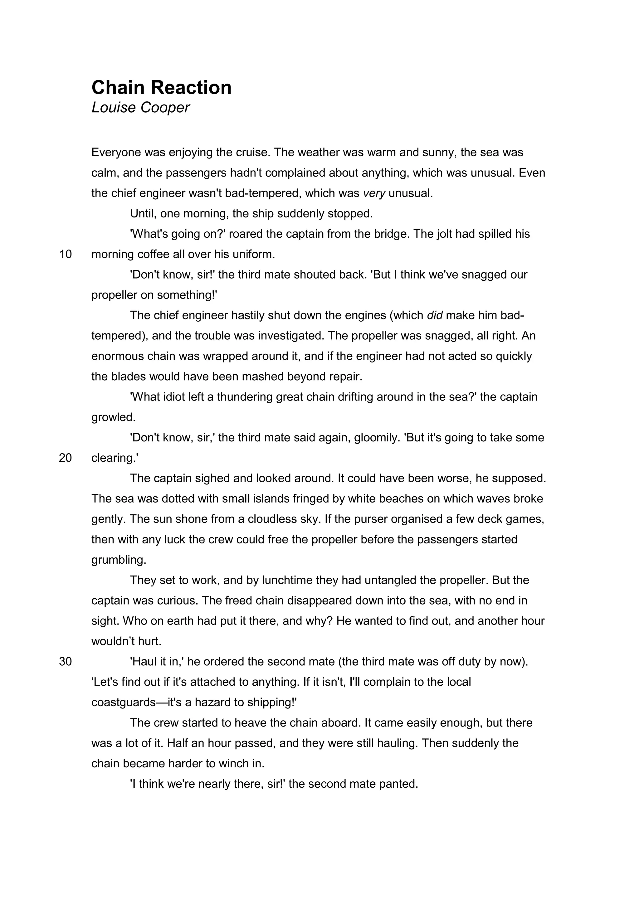 The cruise ship had stopped suddenly when its propeller became entangled with a large chain lying in the sea. The crew worked to untangle the propeller at lunchtime. Intrigued by the source of the chain, the captain ordered more of it to be hauled aboard. They eventually pulled up a large circular plug attached to the end of the chain. The captain then noticed that the nearby islands' beaches were growing larger and cliffs higher, as if the sea level was dropping, realizing pulling up the plug was causing the water to drain out.