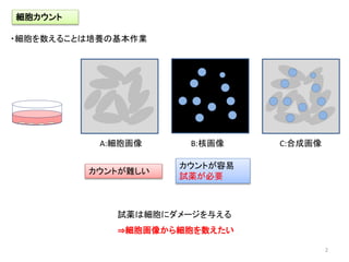 細胞カウント 試薬は細胞にダメージを与える ⇒細胞画像から細胞を数えたい ・細胞を数えることは培養の基本作業 B:核画像 C:合成画像A:細胞画像 カウントが難しい カウントが容易 試薬が必要 2